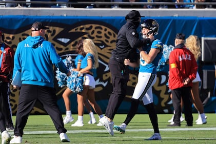 Tennessee Titans v Jacksonville Jaguars - NFL 2025 JACKSONVILLE, FLORIDA - JANUARY 04: Cam Little #39 of the Jacksonville Jaguars celebrates after kicking a 67-yard field goal against the Tennessee Titans during the first half at EverBank Stadium on January 04, 2026 in Jacksonville, Florida. (Photo by Mike Carlson/Getty Images) (Mike Carlson/Getty Images)