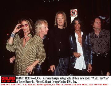 10/17/97 Hollywood, CA. Aerosmith signs their new book, "Walk This Way" at Tower Records. 10/17/97 Hollywood, CA. Aerosmith signs their new book, "Walk This Way" at Tower Records. (Albert Ortega/Getty Images)