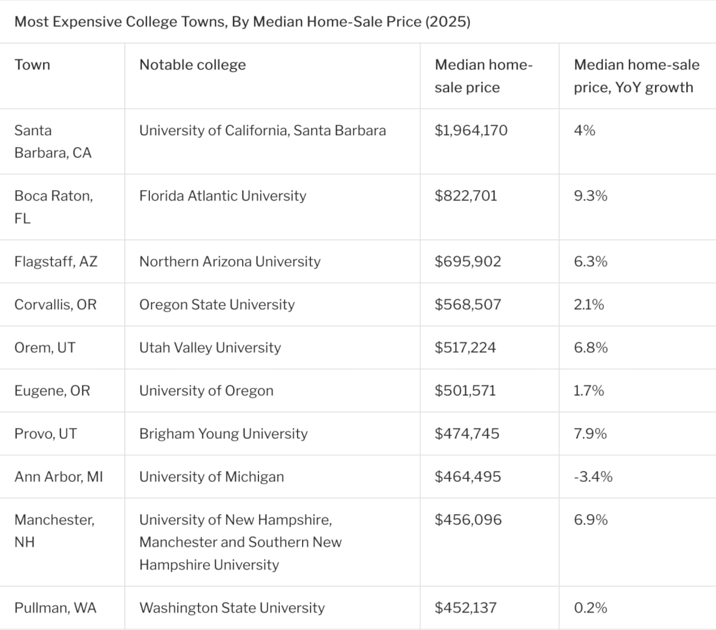 To highlight where costs are highest and lowest, Redfin Real Estate found the most and least expensive college towns in the U.S., ranked by their median sale price.