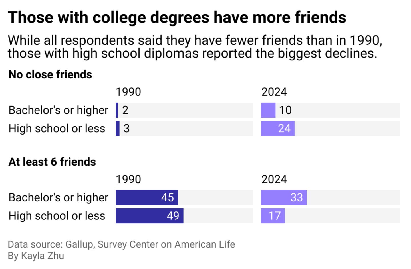 According to the American Social Capital Survey, college graduates are more likely to have at least six close friends, at 25% versus 17%. Roughly 1 in 3 Americans have three to four close friends, and 1 in 4 have six or more close friends.
