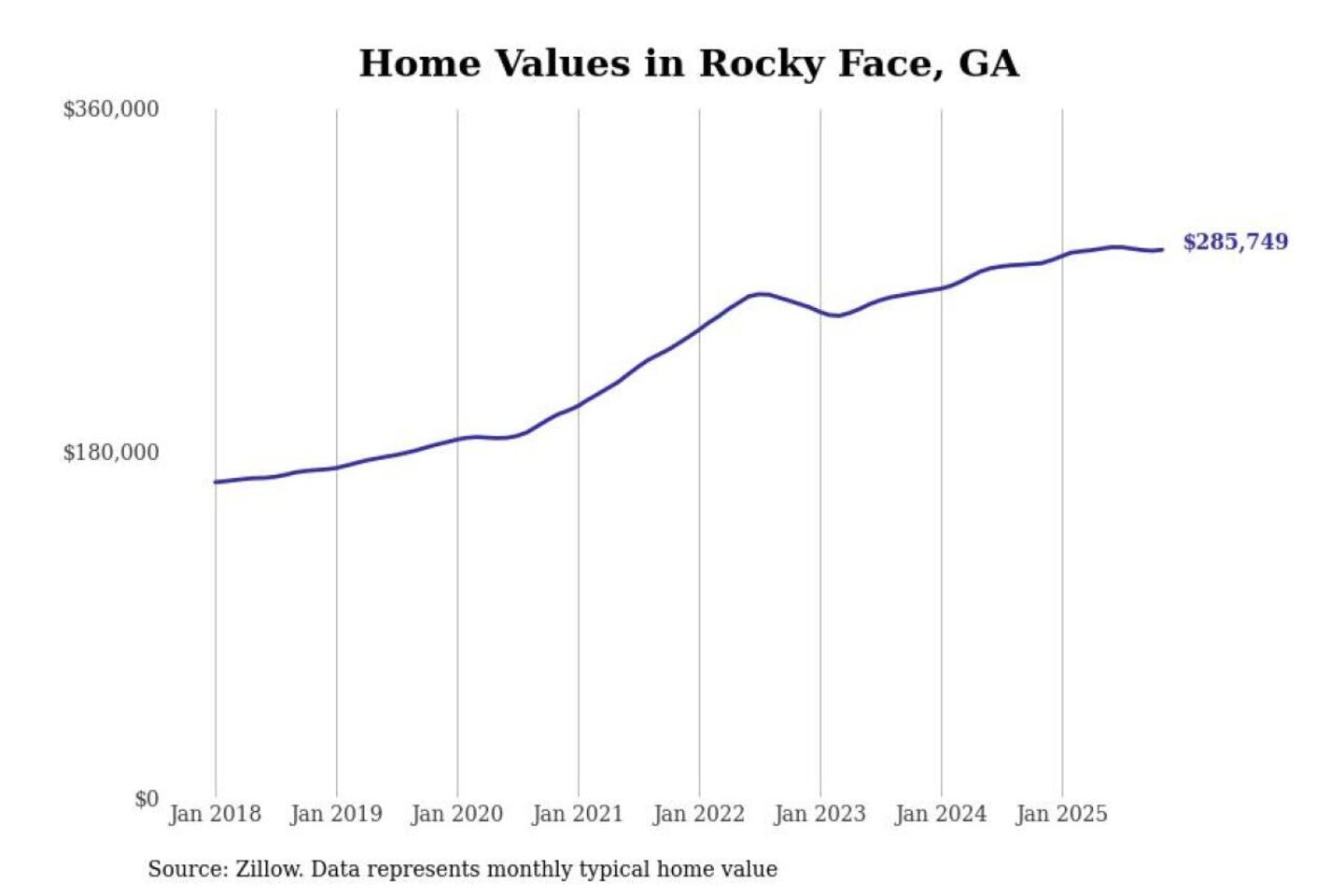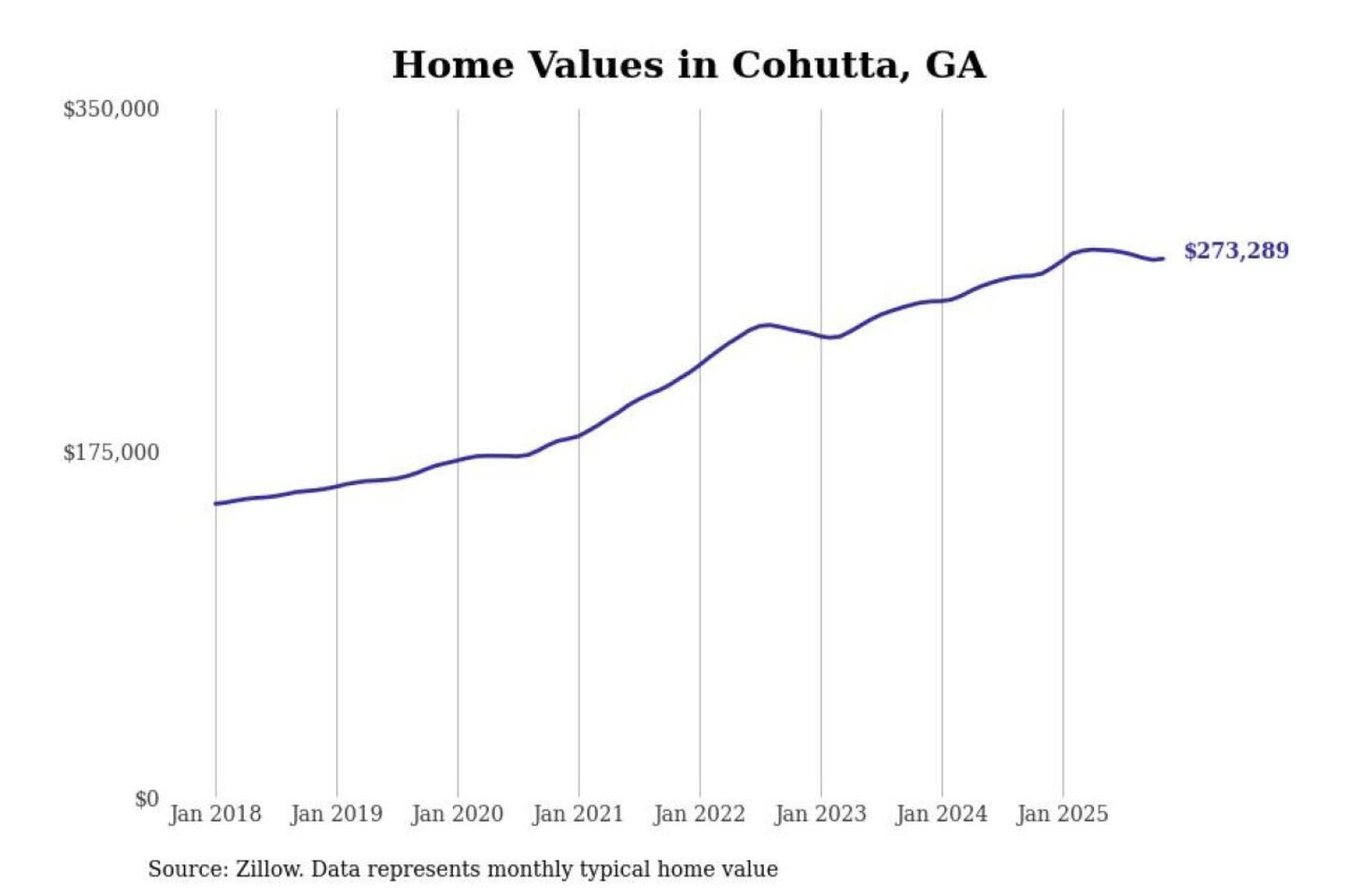 Stacker compiled a list of cities with the most expensive homes in the Dalton, GA metro area using data from Zillow. Charts show the monthly typical home value since January 2018.