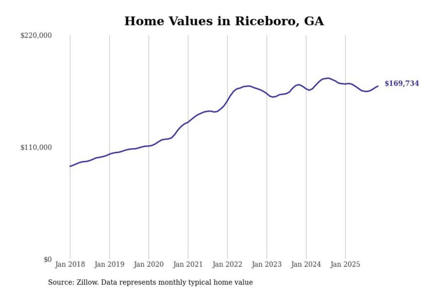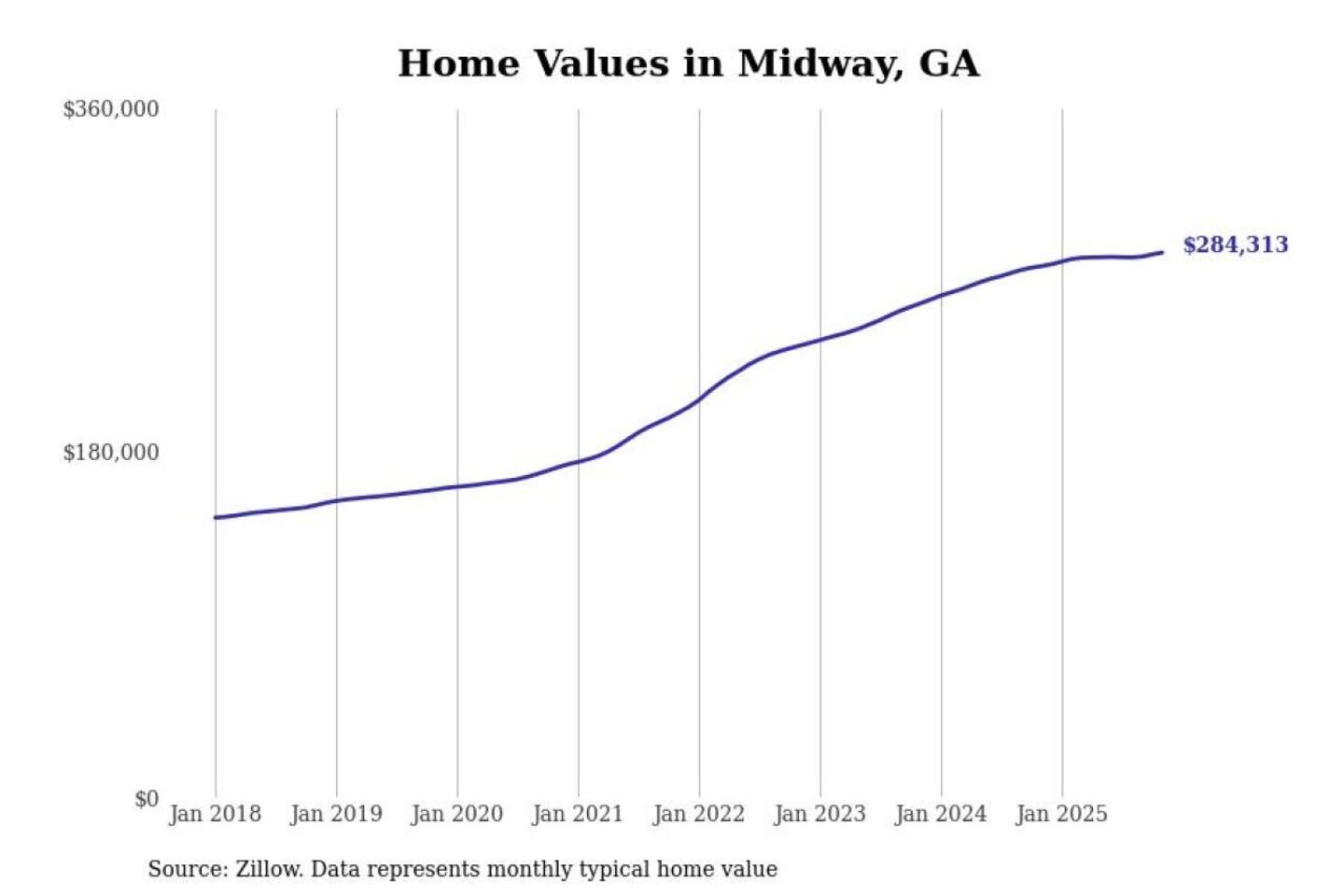 Stacker compiled a list of cities with the most expensive homes in the Hinesville, GA metro area using data from Zillow. Charts show the monthly typical home value since January 2018.