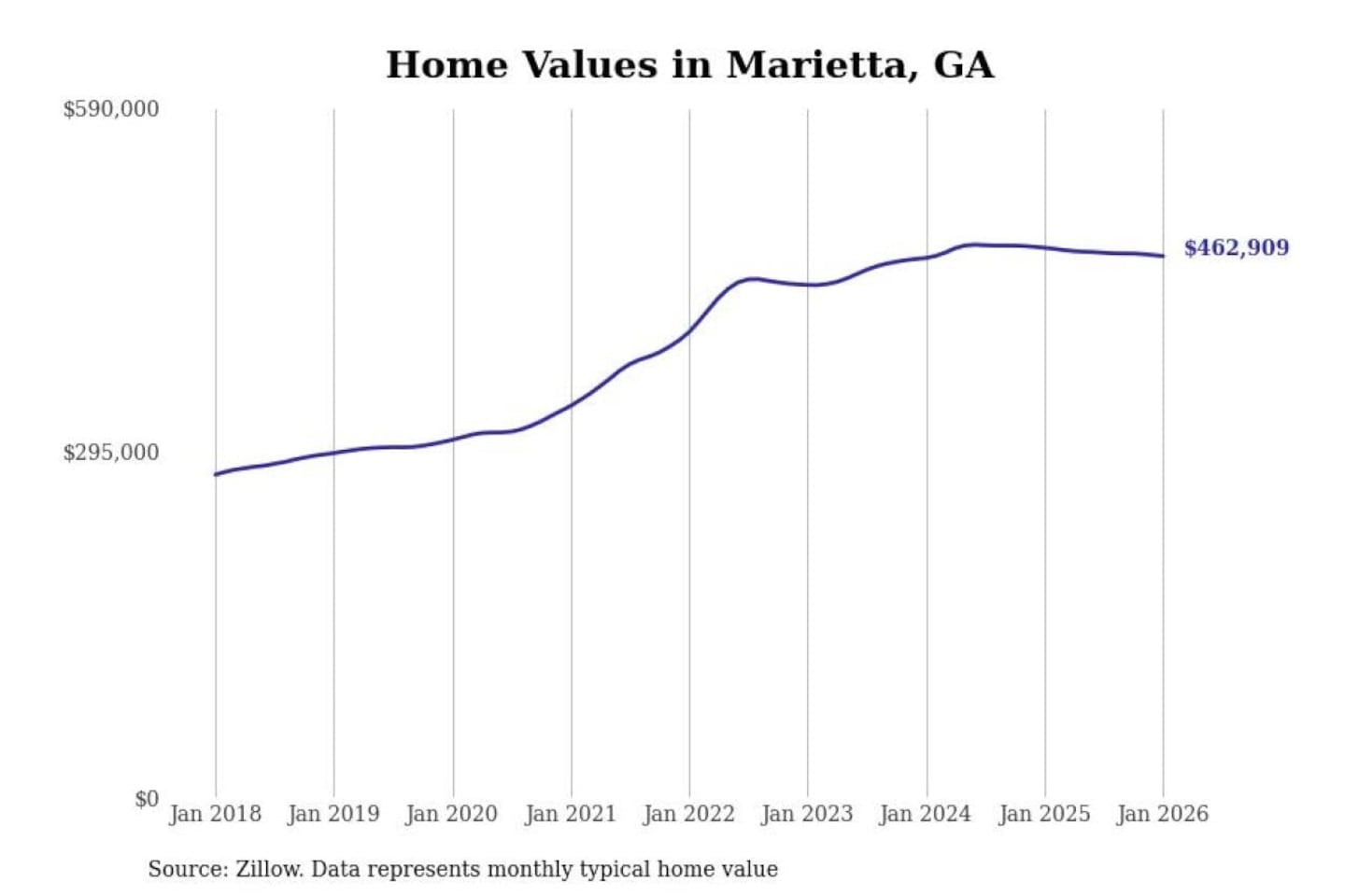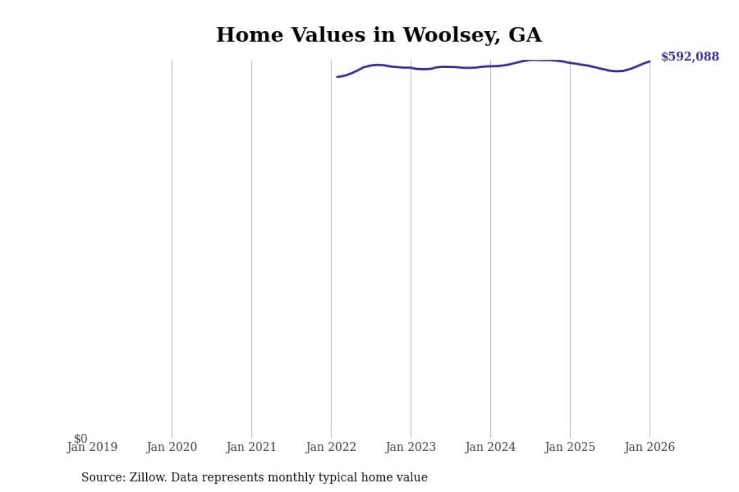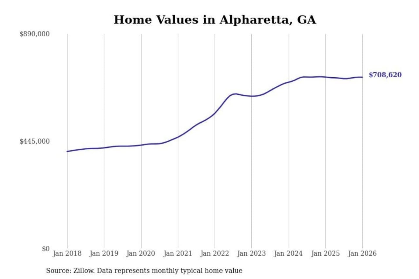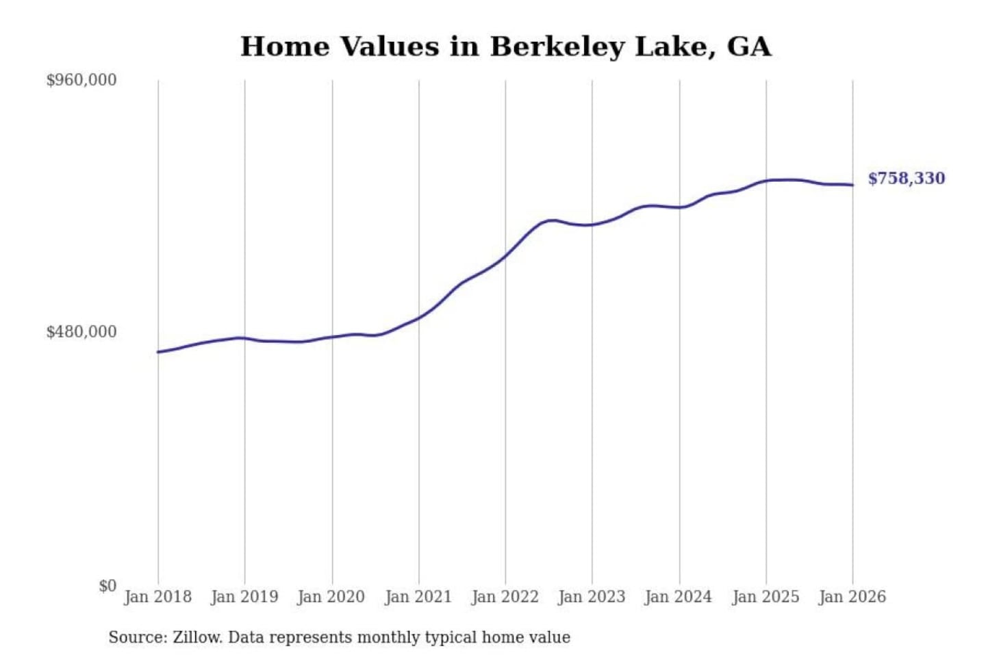 Stacker compiled a list of cities with the most expensive homes in the Atlanta metro area using data from Zillow. Charts show the monthly typical home value since January 2018. Data was available for 149 cities and towns.