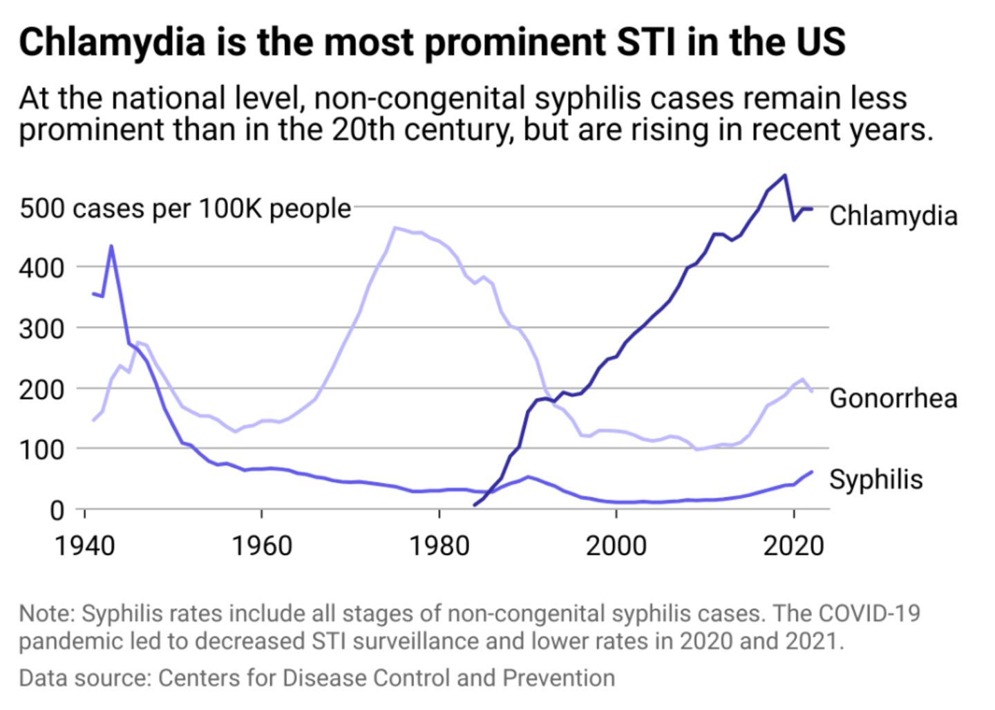 Sexually transmitted infections are on the rise, putting more people at risk as they spread. Chlamydia rates have nearly doubled since 2000, while the rate of gonorrhea went up by 50% over the same period. The Centers for Disease Control and Prevention reports that syphilis rates are reaching levels last seen in the 1950s.