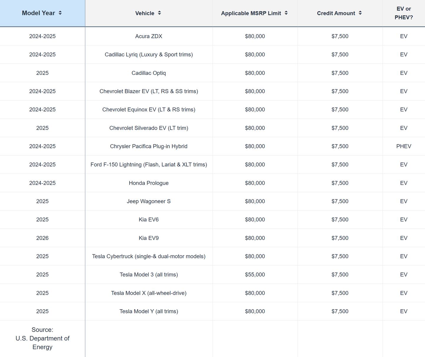 This list is based on data from the U.S. Department of Energy, last updated on January 14, 2025. It affects new cars placed in service from January 1 through December 31, 2025. The list will likely change to include more models in the coming months and years. Edmunds will strive to keep the list current as vehicle manufacturers continue to submit the applicable vehicle information to the relevant government agencies. For those who purchased a vehicle in 2024, the list of eligible vehicles is here.