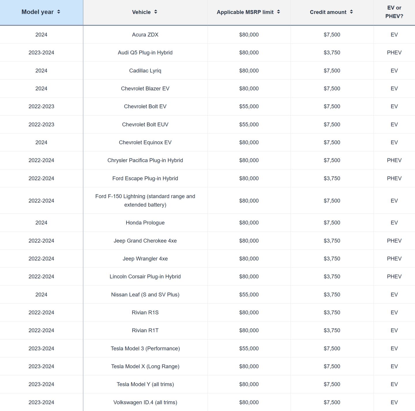 The following price caps by vehicle type became effective as of January 1, 2023, and refer specifically to the manufacturer's suggested retail price, or MSRP. It does not include the manufacturer's destination charge, optional items added by the dealer, or taxes and fees. For example, if you're looking at an SUV with a $79,990 MSRP, and the destination fee takes it over $80,000, the vehicle is still eligible. If, for example, the vehicle is priced above the MSRP limit (let's say $82,000), but there's a manufacturer incentive that brings it back down to $80K, the vehicle would also not be eligible.