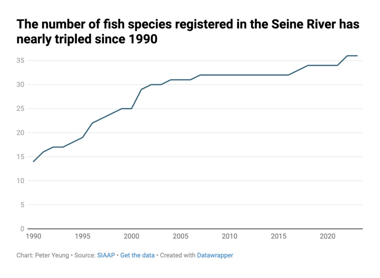 In fact, in the 1970s, only three fish species were left in the 777-kilometer (482-mile) river, which spans northern France and cuts through the capital city. But after decades of urban water policies alongside community efforts, nearly 40 have been officially registered, with new species appearing constantly.