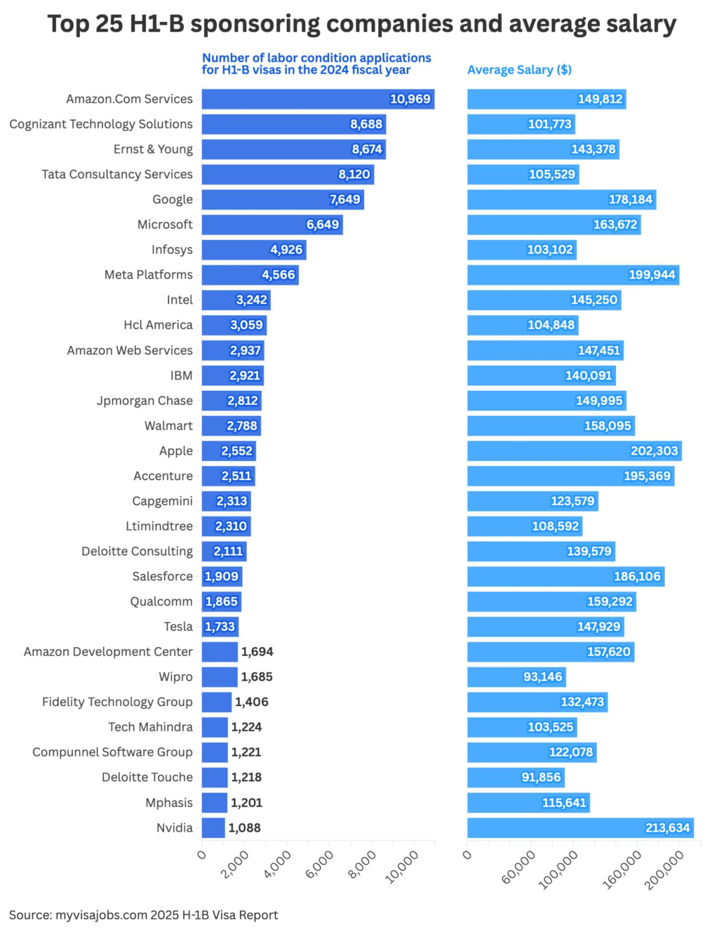 As this breakdown from MyVisaJobs shows, big tech and consulting firms dominate the top of the list. These companies rely heavily on global talent pipelines to maintain product development, infrastructure, and client services.