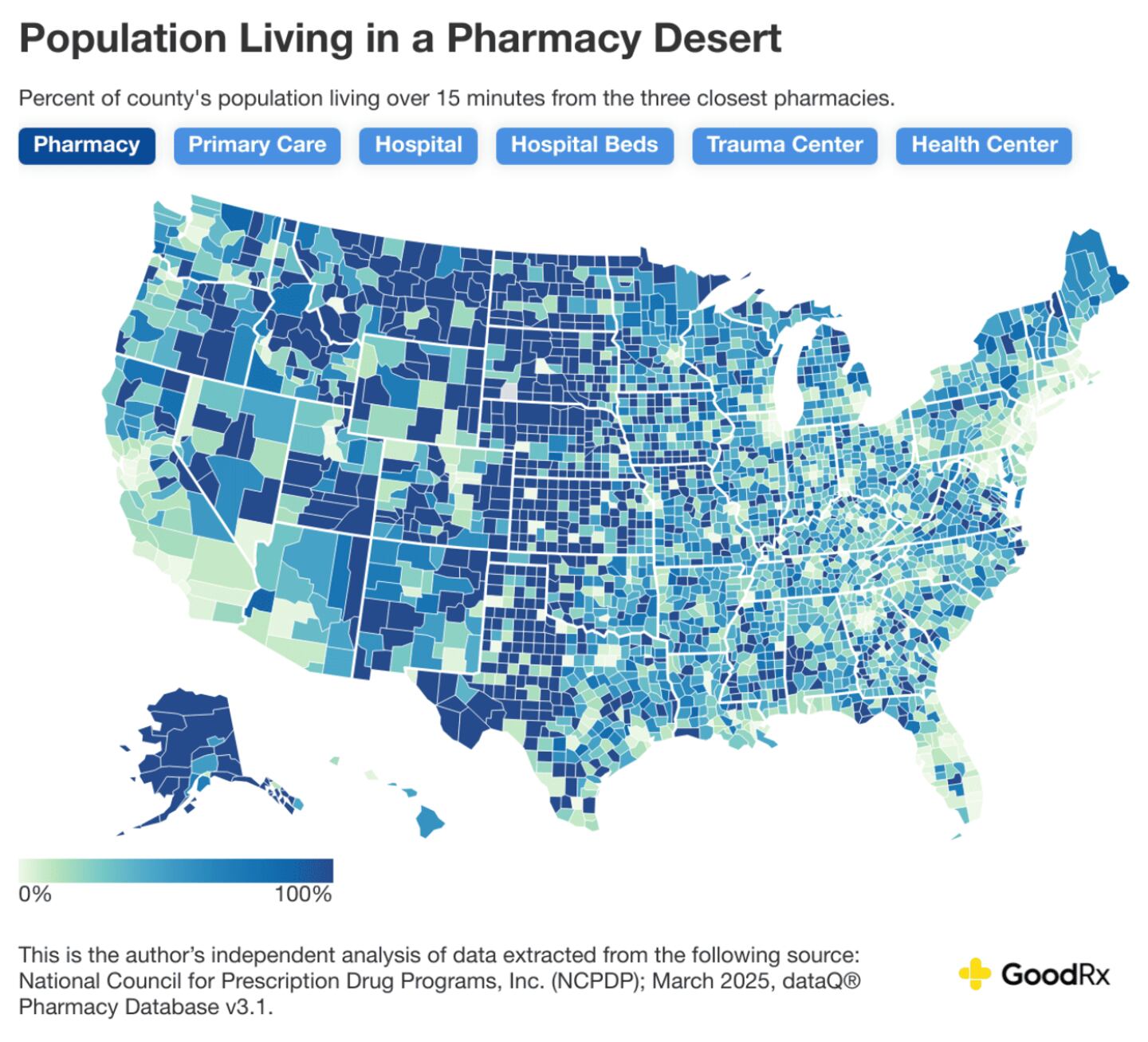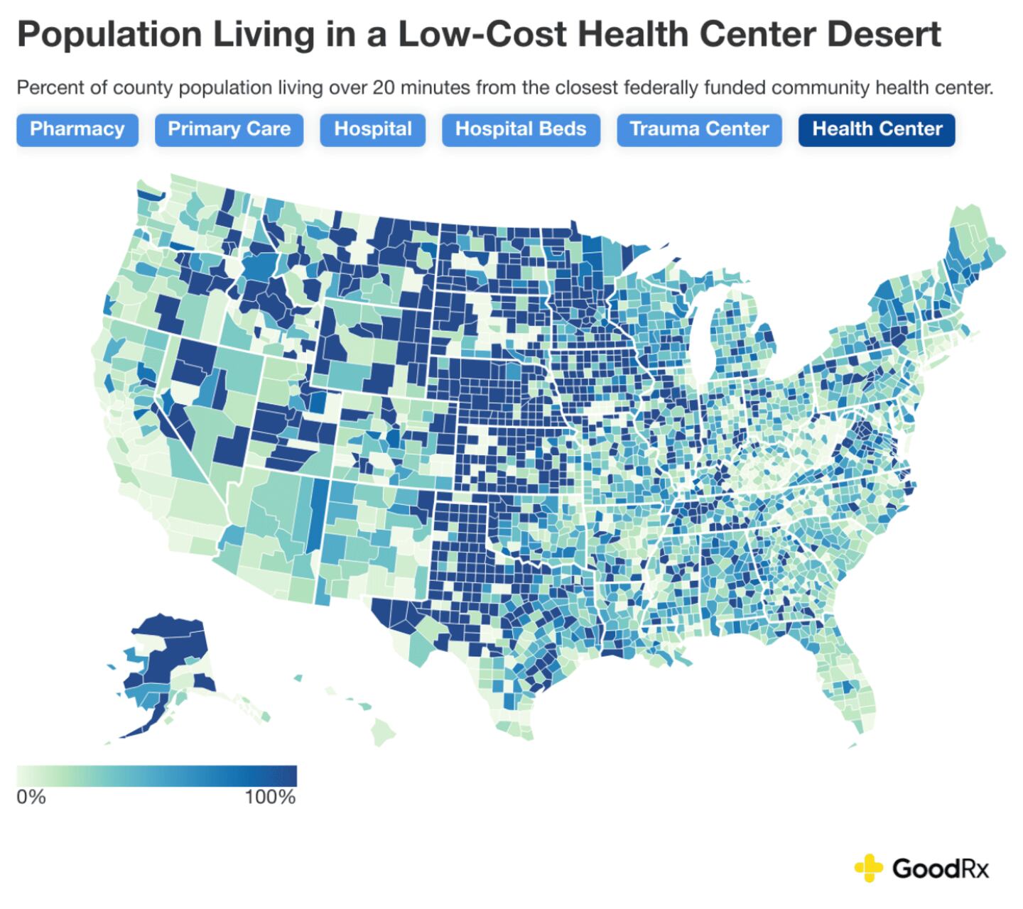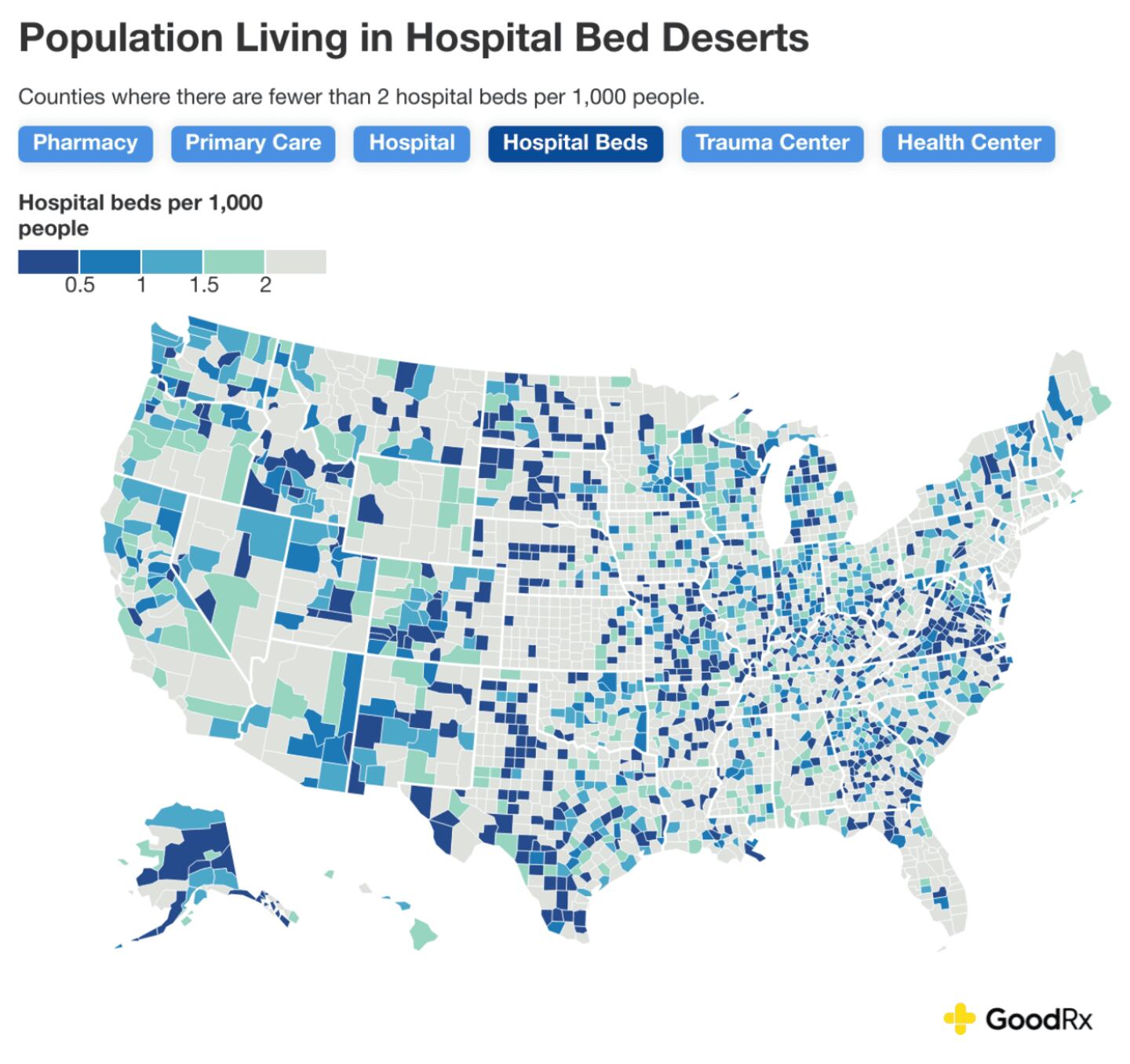 Today, roughly 81% of counties across the U.S. are healthcare deserts of some kind, meaning the majority of the population lacks proper access to pharmacies, primary care, hospitals, hospital beds, trauma centers, or community health centers. GoodRx estimates show that over 120 million people currently live in a healthcare-desert county, accounting for roughly a third of the U.S. population.