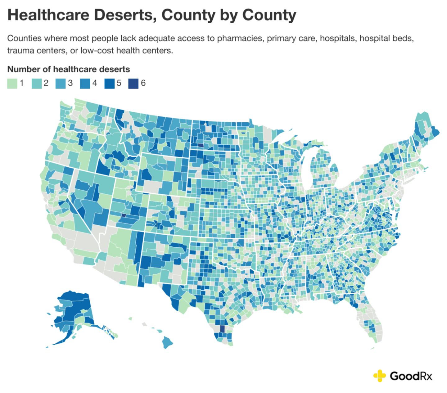 In 2021, GoodRx, a platform for medication savings, published its first comprehensive report on the state of "healthcare deserts" in the U.S. It identified areas that lack adequate infrastructure to ensure a healthy community, including access to pharmacies, primary care, hospitals, emergency services, and low-cost community health centers.