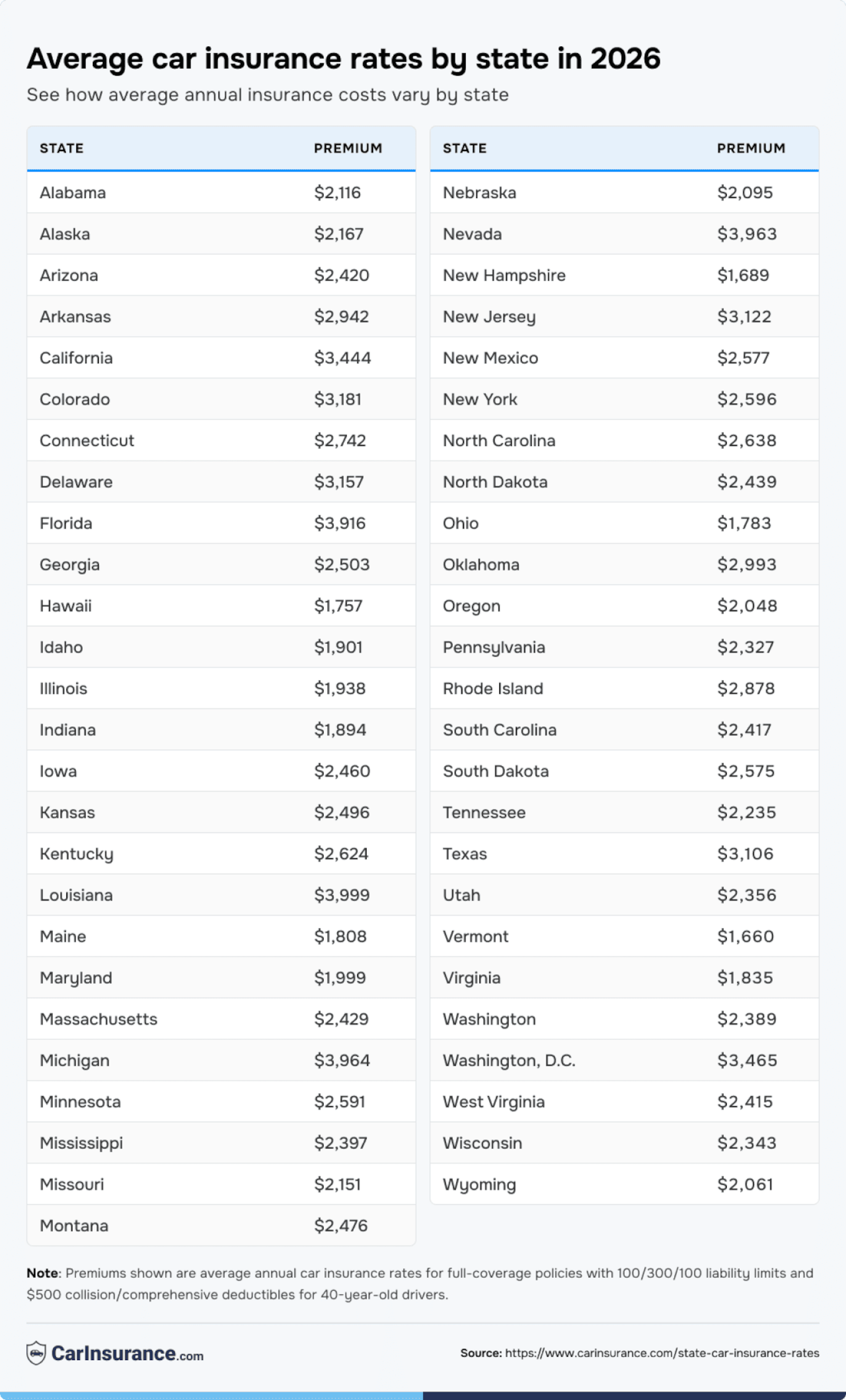 CarInsurance.com analyzed rate data for all 50 states and Washington, D.C., revealing just how wide that gap has become in 2026. The national average annual premium for a full-coverage policy now costs $2,578, but individual state averages range from $1,660 to $3,999, a difference of $2,339 per year.