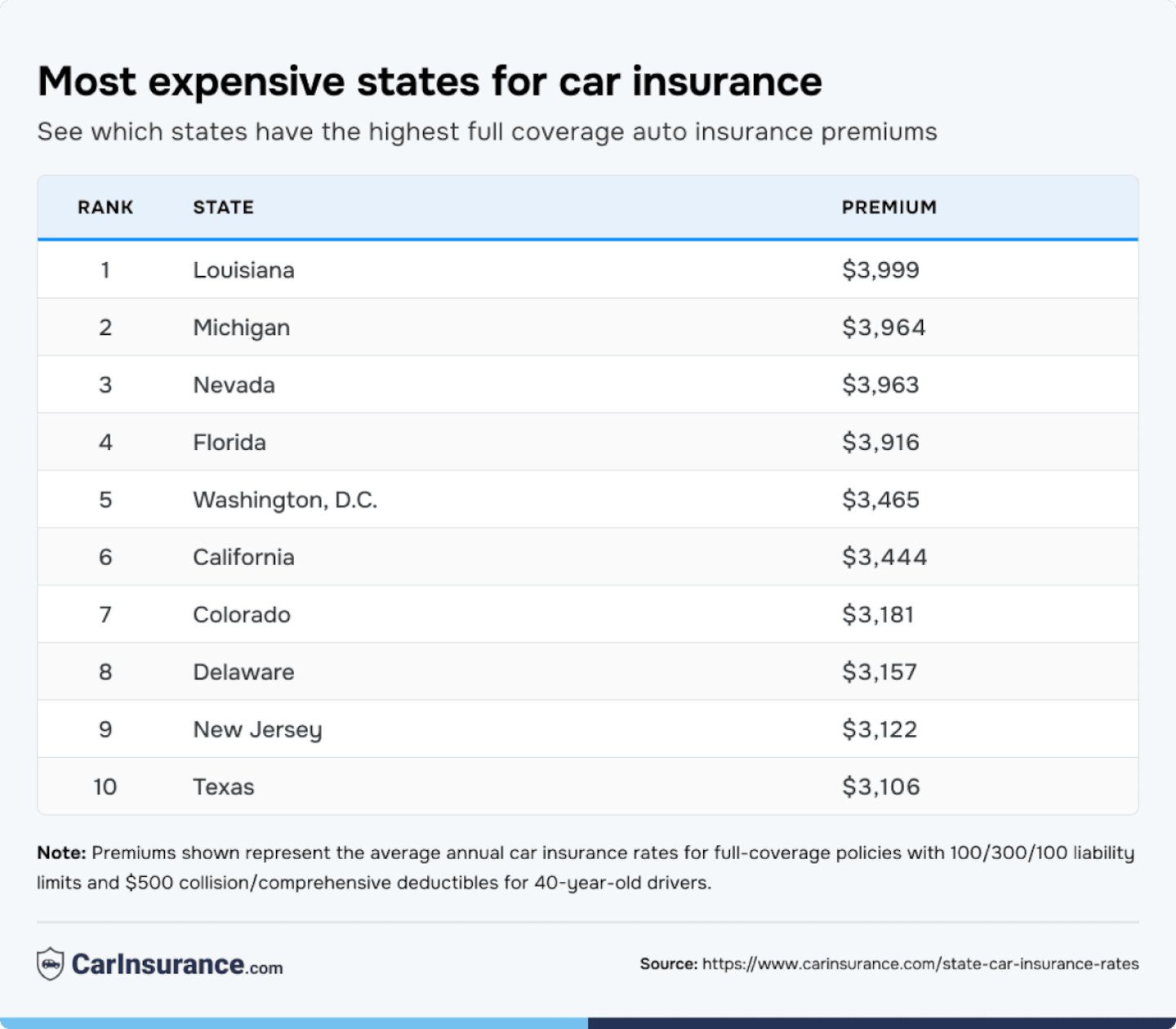 Louisiana ($3,999), Michigan ($3,964), Nevada ($3,963), Florida ($3,916) and Washington, D.C. ($3,465) are the most expensive states for car insurance in the U.S.