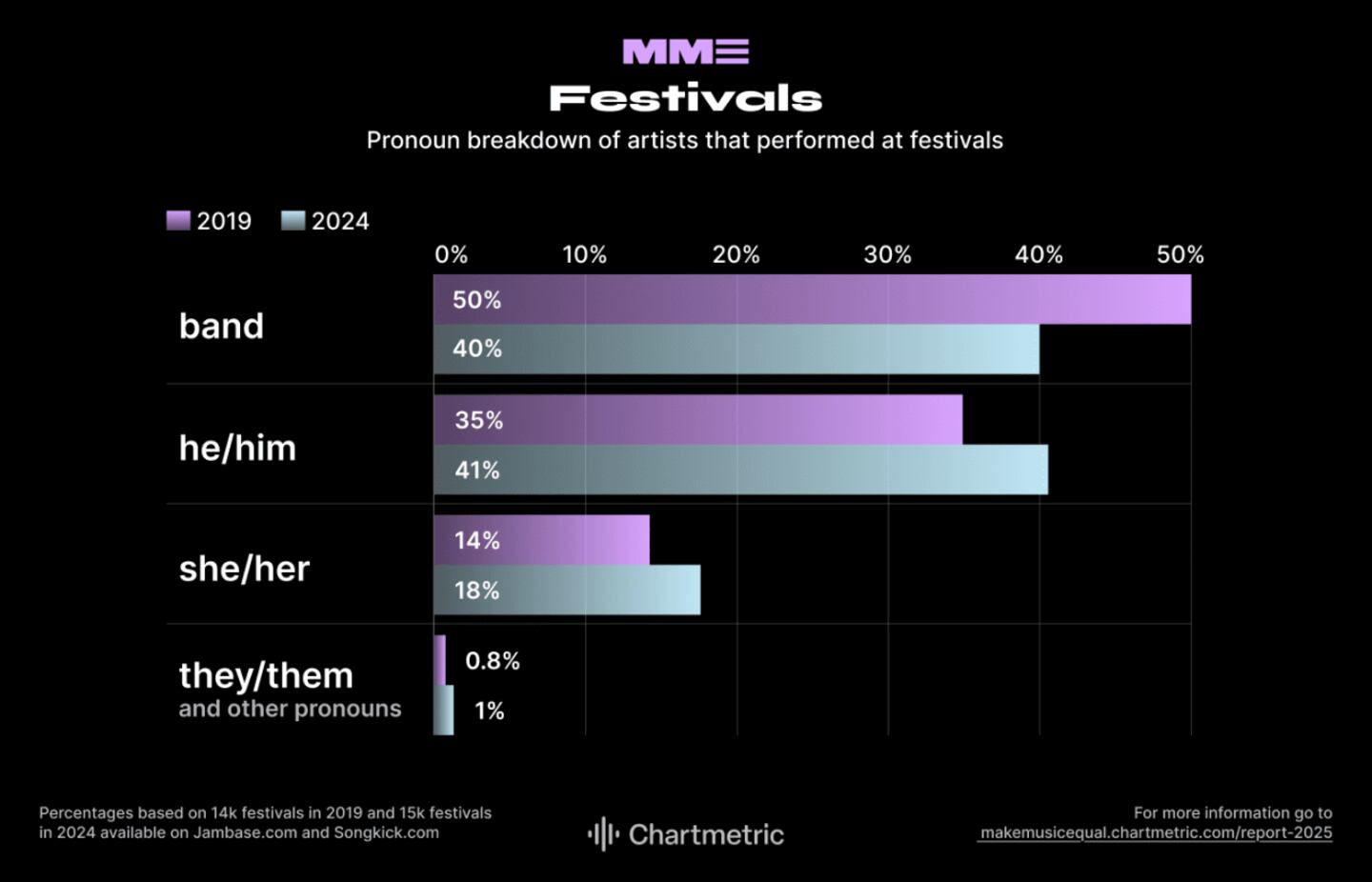 The number of she/her artists performing at festivals has risen by 3% since the pre-pandemic era, with he/him acts also seeing a modest 2% increase.