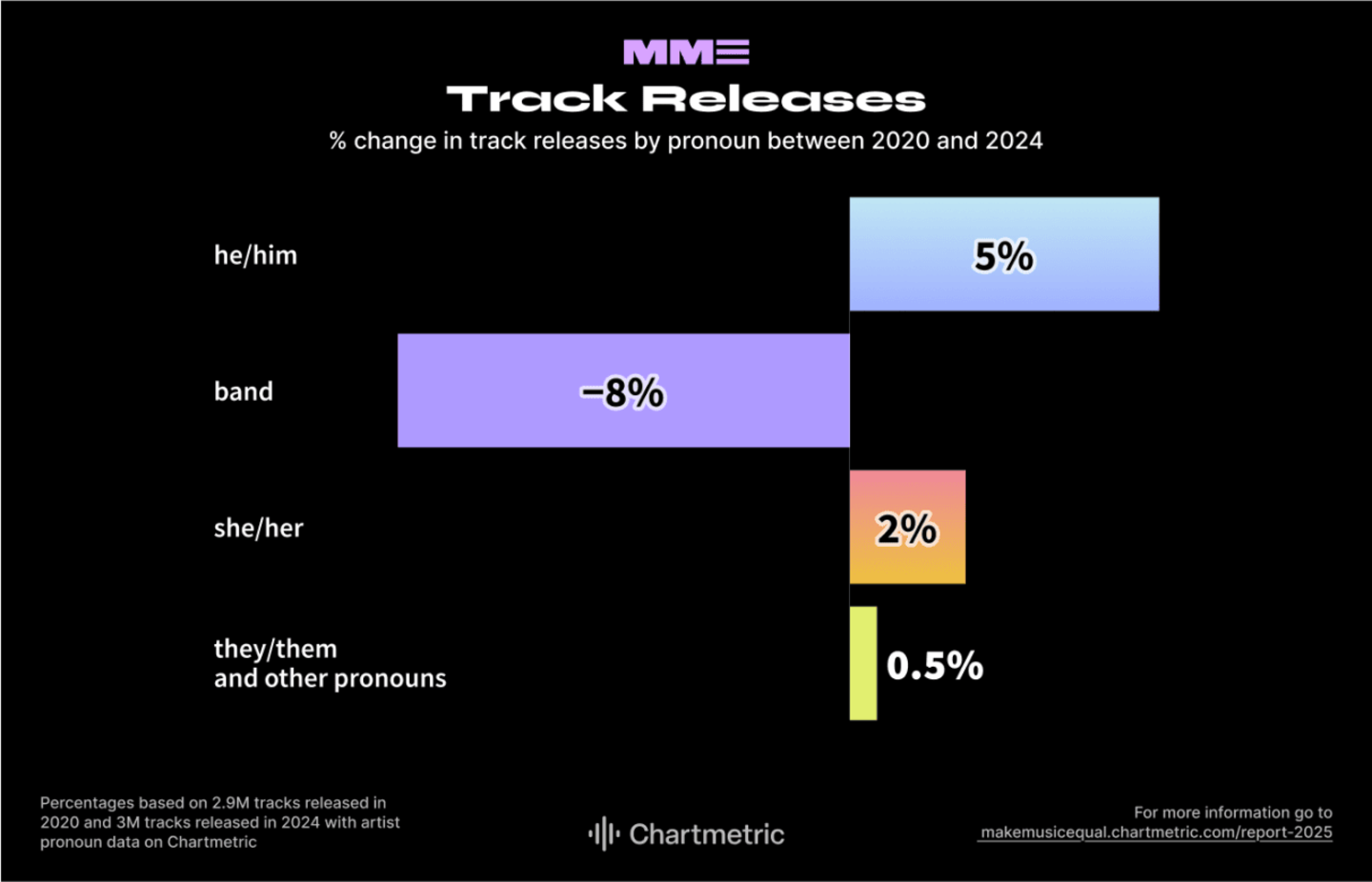 6. Track Releases: Percentages based on 2.9 million tracks released in 2020 and 3 million tracks released in 2024 from artists with pronoun information on Chartmetric.