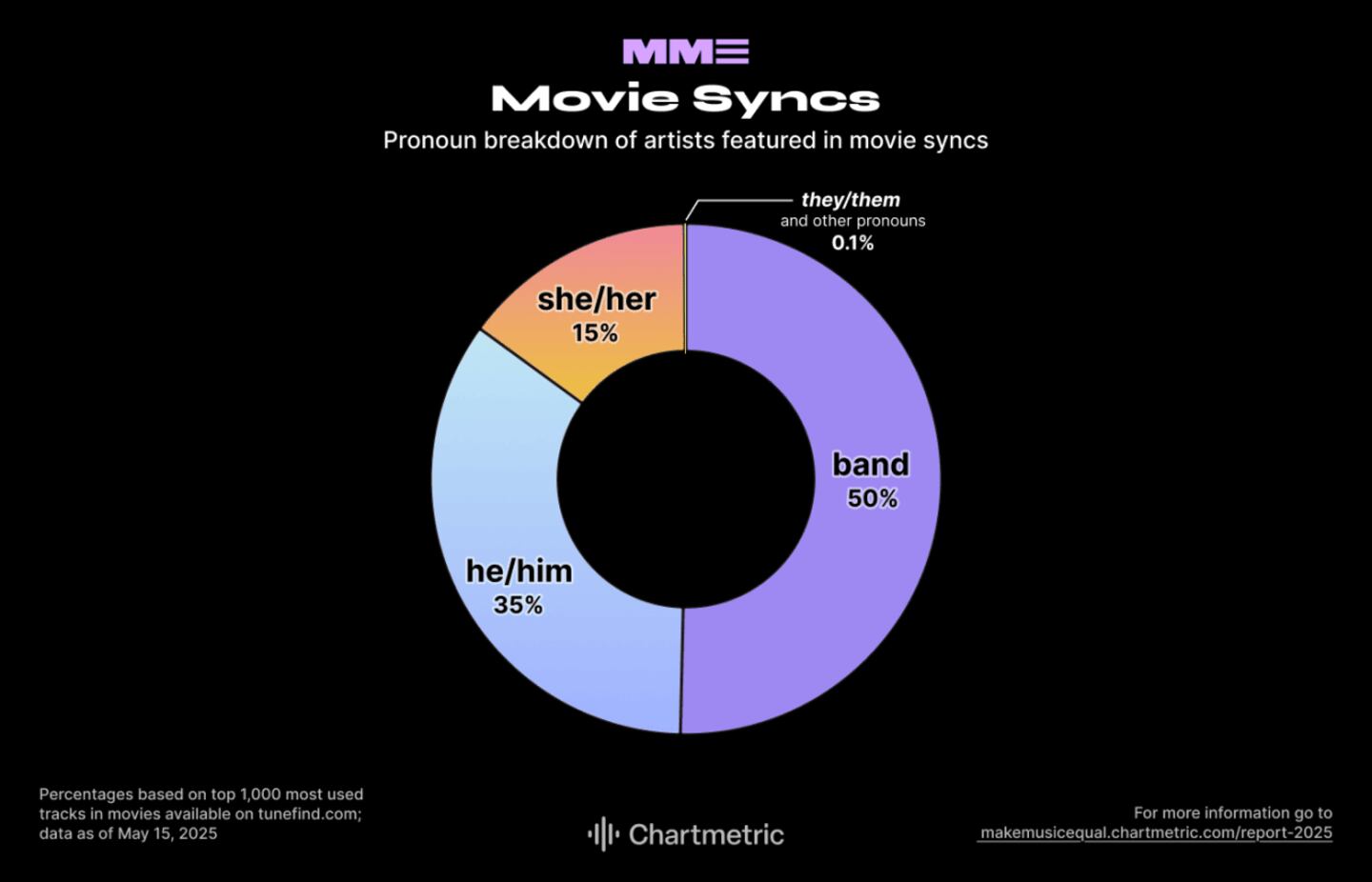 The most-used movie tracks are by 50% bands, 35% solo men, and 15% solo women. Of the three sync ecosystems, video games show the greatest gender disparity: 49% of featured solo artists are men, while only 6% are women.