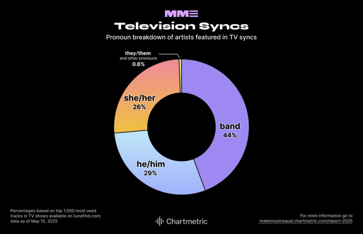 Bands dominate the soundtrack of TV: 44% of top-used sync artists are groups. Still, the use of music from men and woman is almost equal at 29% and 26%, respectively.
