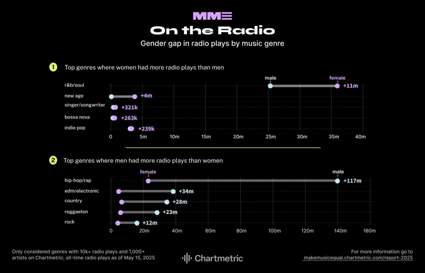 8. Radio: Only genres with over 10,000 radio plays and 1,000 artists were considered. All-time radio plays are as of May 15, 2025.
