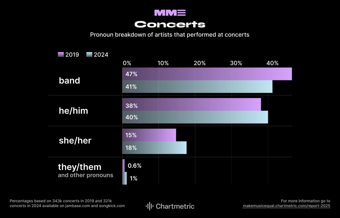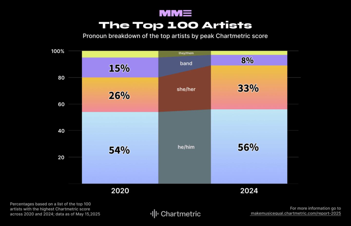 The music industry has long been a mirror of cultural identity and expression, but its reflection of equality has remained distorted. To answer the question of who is visible in today's music industry, and who is not, Chartmetric launched the Make Music Equal report, the industry's only pronoun dataset and identity tracker. The project exists as three parts: