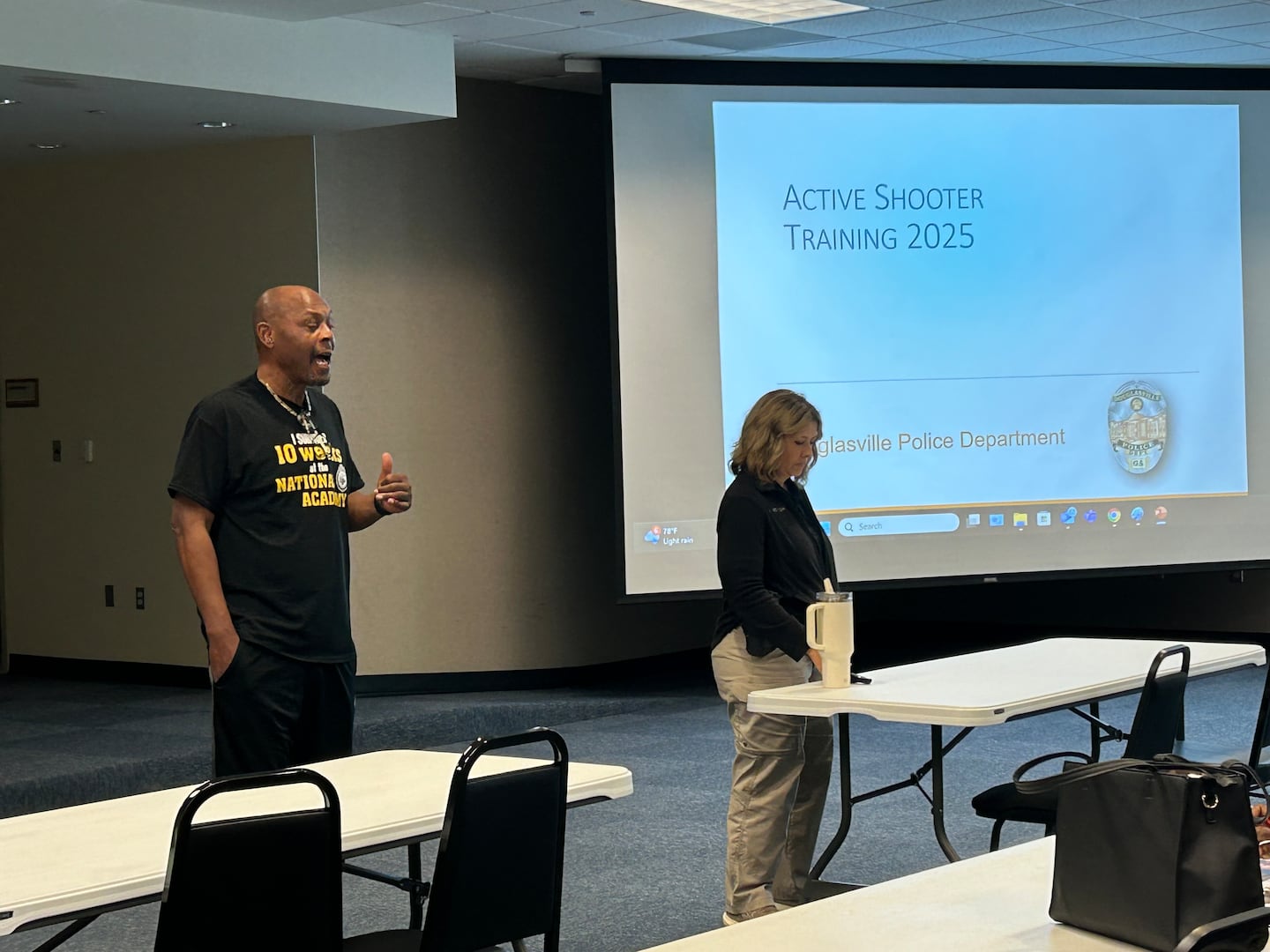 Douglasville Police Chief Gary Sparks and Sgt. Victoria Bender provided training tips to help educate the community on responding to active shooter situations. The session covered strategies ranging from the “run-hide-fight” method to the OODA loop—observe, orient, decide, act.