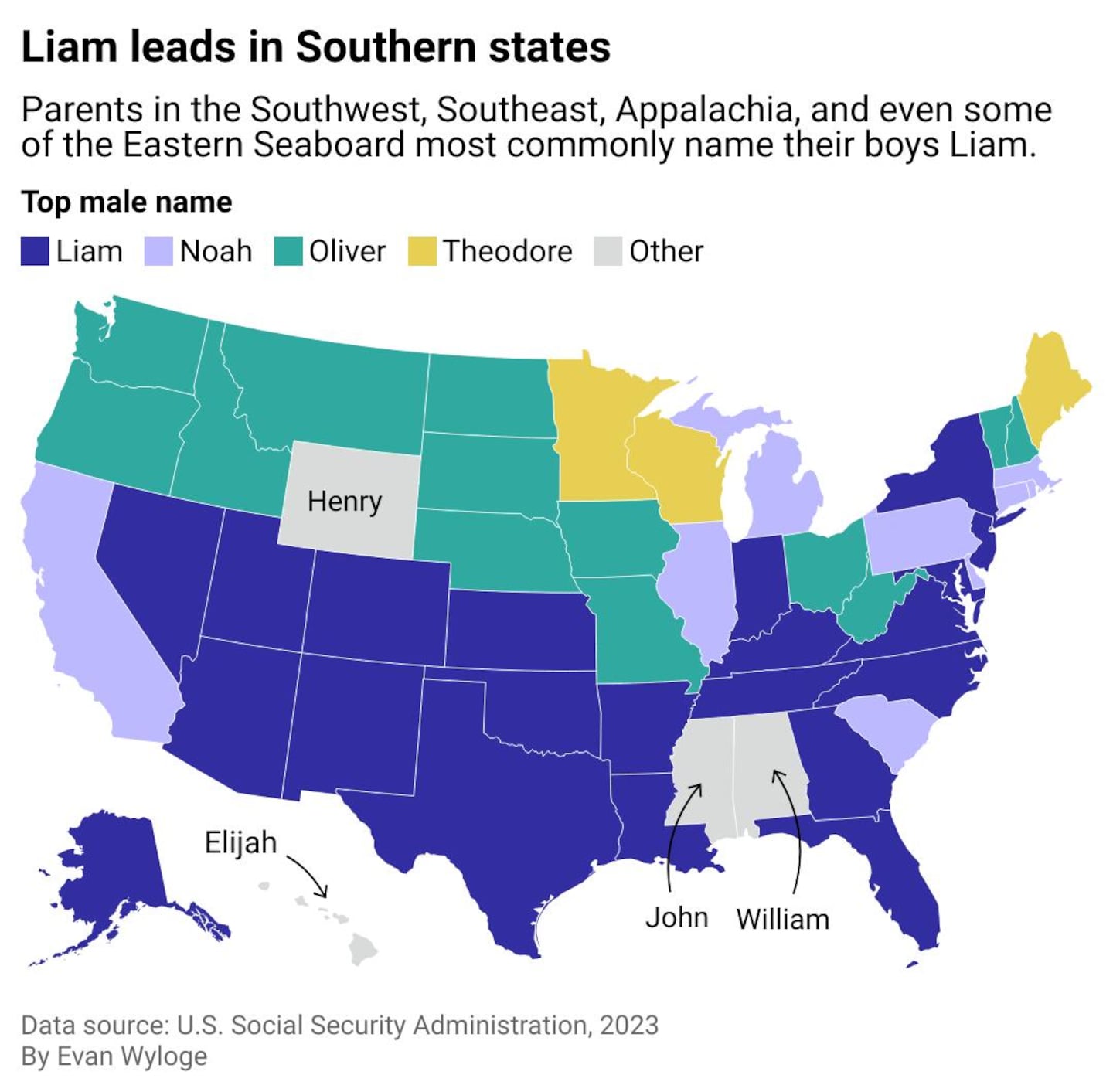 Despite the longevity of Liams and Olivias, the trends in baby names aren't uniform, with some significant geographic variation. Different states and regions of the country have some unique preferences. Spokeo broke down state-level trends in baby name popularity, examining how some of the most dominant names took off. For baby boys, Oliver is actually the most popular name in a broad swath of America. And for baby girls, Charlotte and Amelia have their own regional appeal.