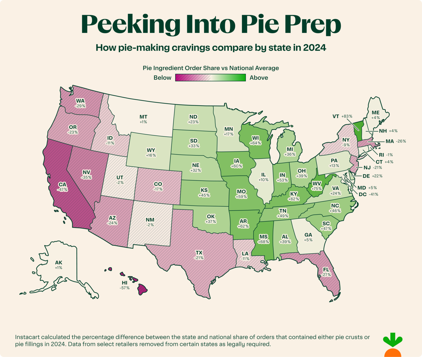 • Scratch-made love: Vermont led the charge, buying pie crusts and fillings 83% more often than the national average in 2024. West Virginia (75% more often), Mississippi (68%), Wisconsin (64%), and Kentucky (62%) also showed a strong appetite for pie-making essentials.