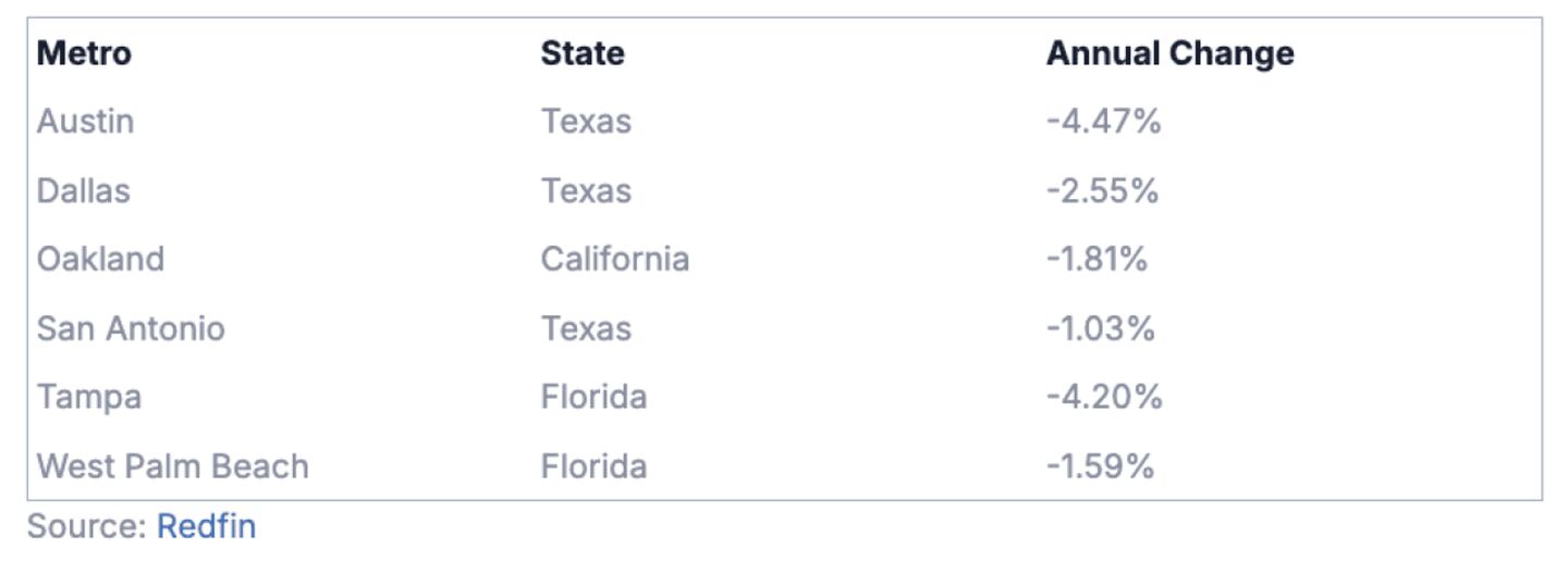 Thirteen of the 50 largest metro areas posted year-over-year declines last month. Redfin flags six of them with drops greater than 1%. The steepest falls appear in Florida and Texas, two states that saw outsized pandemic-era home price booms.