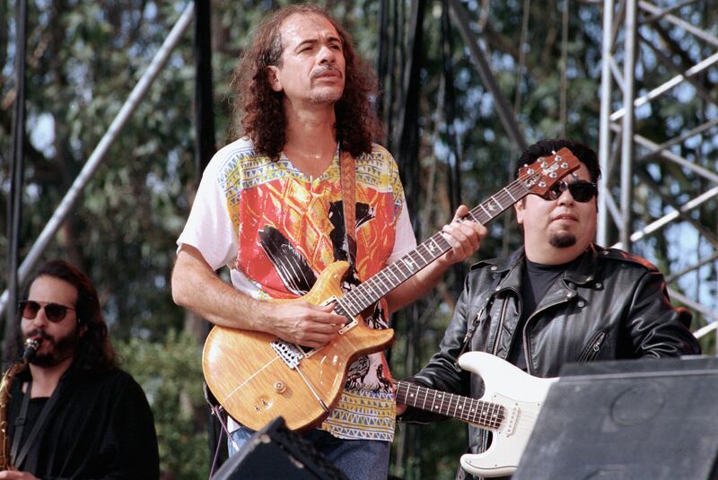 Photos: Carlos Santana through the years 1991: Rock guitarist Carlos Santana, center, performs with Cesar Rosas, guitarist with rock group Lobo Los, during a tribute concert to legendary rock promoter Bill Graham at San Francisco's Golden Gate Park, Ca., Sunday, Nov. 3, 1991. (AP Photo/Olga Shalygin)