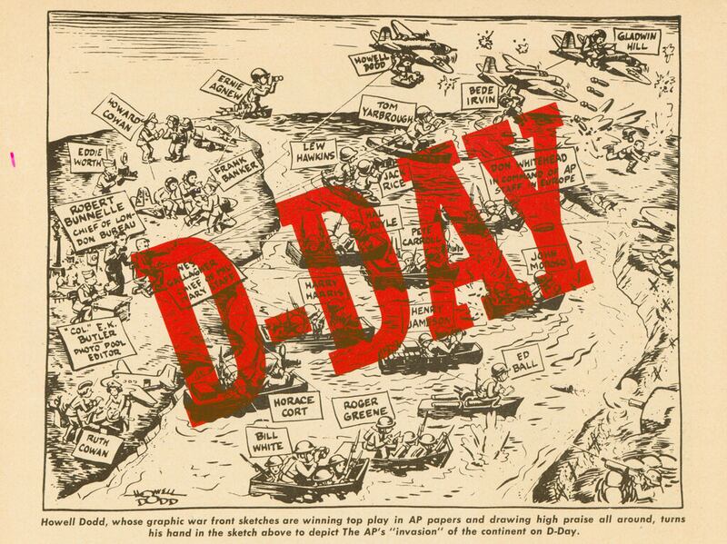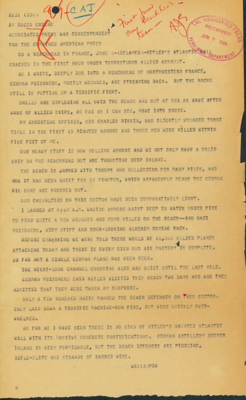 The Associated Press had correspondents on the ground with troops landing on the beaches of Normandy in addition to reporters in various locations in England. Here is the story that was filed about the invasion. It ran in newspapers around the world on June 8, 1944.