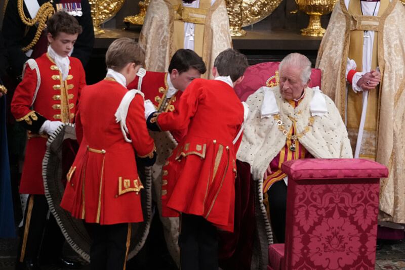 Update 5:53 a.m. EDT, May 6: King Charles III takes his place in the Coronation Chair for his investiture.
