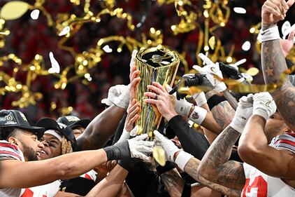 2025 CFP National Championship Presented by AT&T- Ohio State v Notre Dame ATLANTA, GEORGIA - JANUARY 20: The Ohio State Buckeyes hoist the trophy after beating the Notre Dame Fighting Irish 34-23 in the 2025 CFP National Championship at the Mercedes-Benz Stadium on January 20, 2025 in Atlanta, Georgia. (Photo by Alex Slitz/Getty Images) (Alex Slitz/Getty Images)
