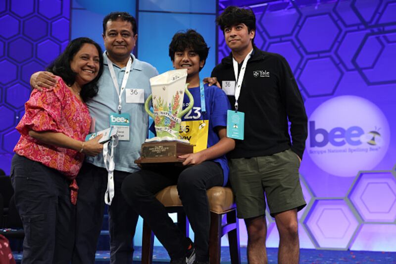 95th Scripps National Spelling Bee NATIONAL HARBOR, MARYLAND - JUNE 01: Speller Dev Shah of Largo, Florida, celebrates with his father Deval Shah, mother Nilam Shah, brother Neil Shah and grandmother Vinaben Shah after he won the 2023 Scripps National Spelling Bee at Gaylord National Hotel and Convention Center on June 1, 2023 in National Harbor, Maryland. Shah correctly spelled the word "psammophile" and won the competition. (Photo by Alex Wong/Getty Images) (Alex Wong/Getty Images)