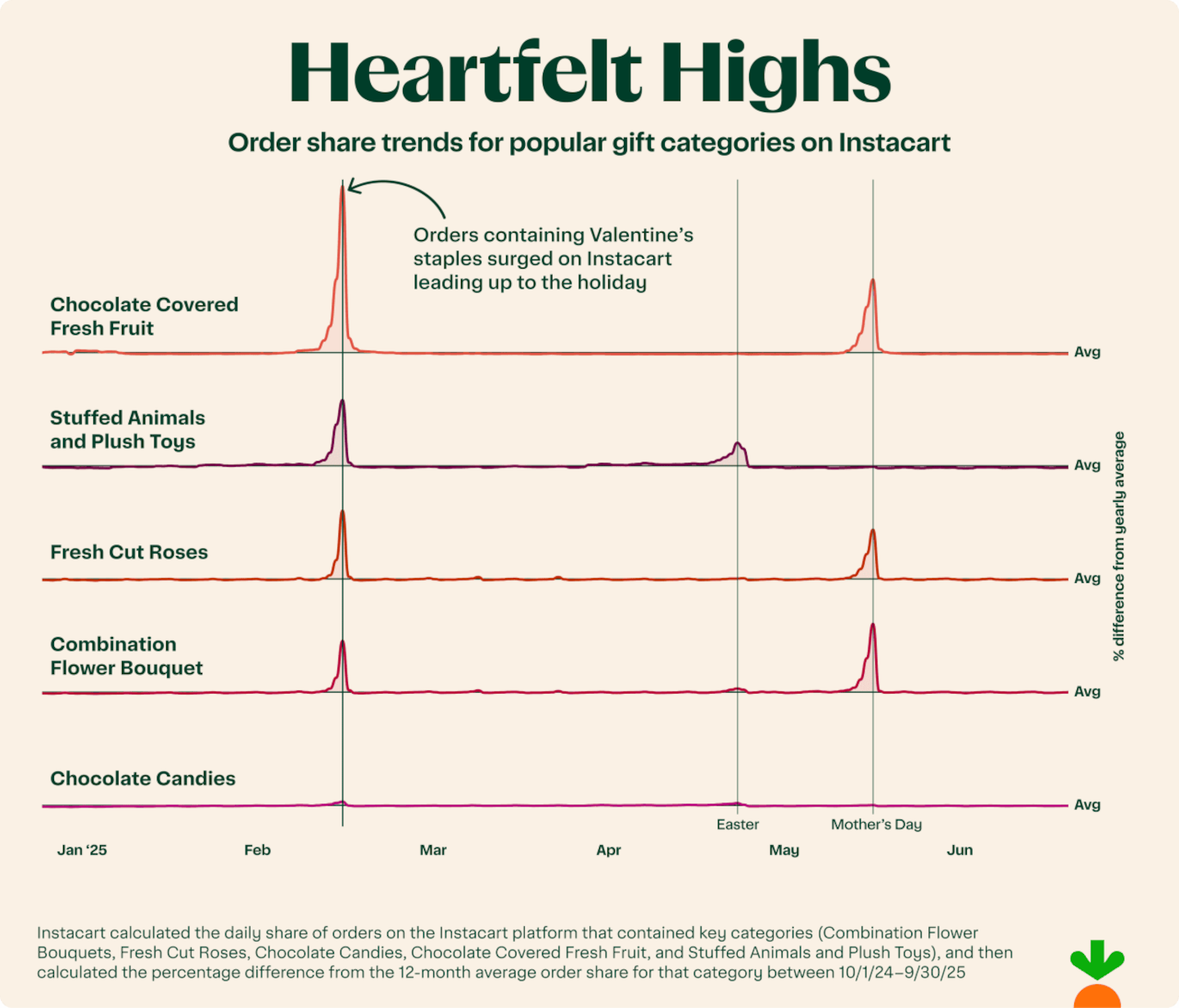 When it comes to gifting on the Instacart platform, Valentine's Day stands in a league of its own. Based on 2025 purchase data, Valentine's Day was one of the top two gifting days of the entire year – second only to Mother's Day (hi, Mom!).