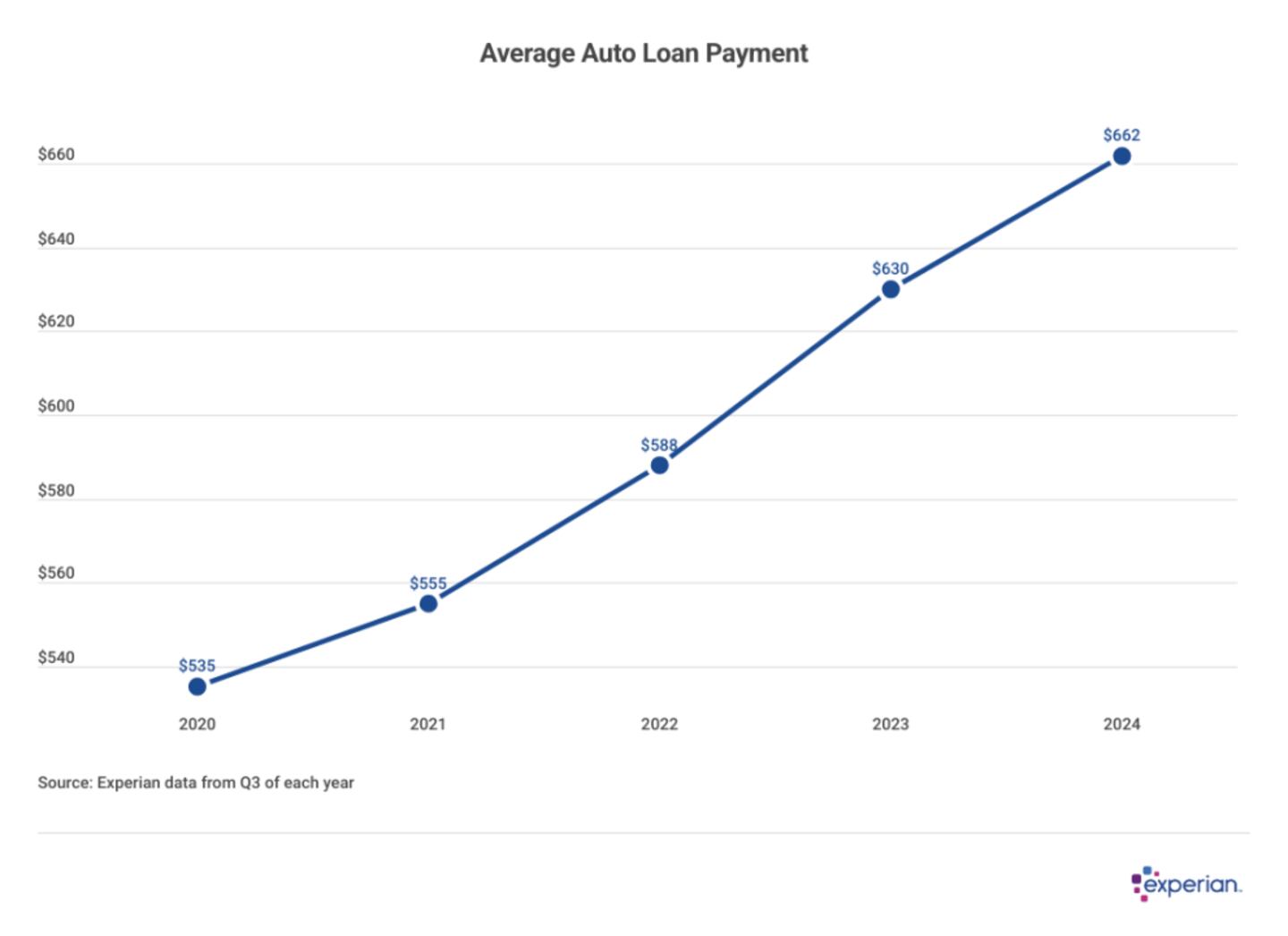 In step with total loan amounts increasing, average auto loan payments rose 5.1% to $662 per month from 2023 to 2024: