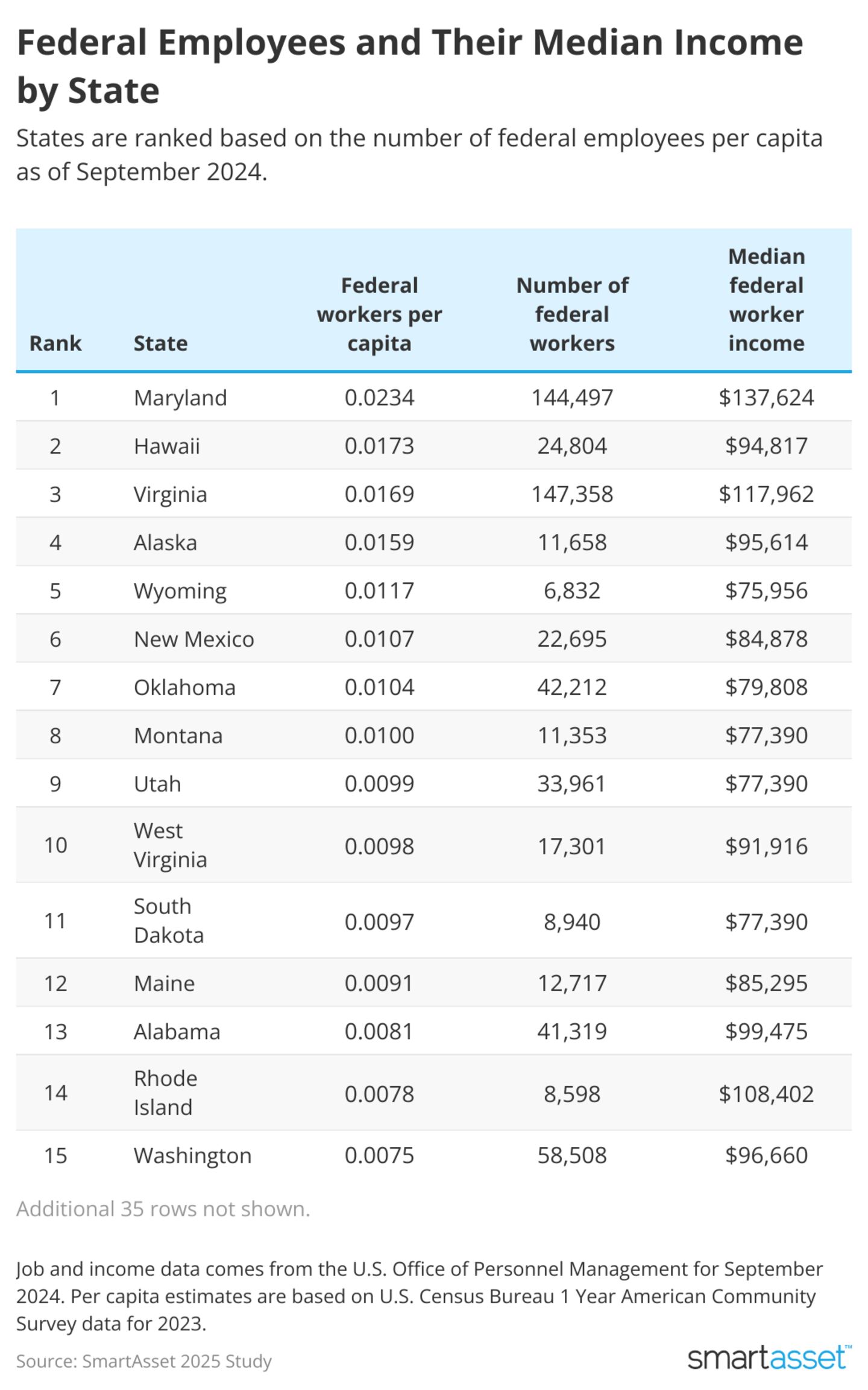 - Maryland has the most federal workers per capita—and the highest paid. As of September 2024, there were 144,497 federal employees in Maryland, or 0.023 workers per state resident. The median salary for these workers is $137,624, more than any other state.