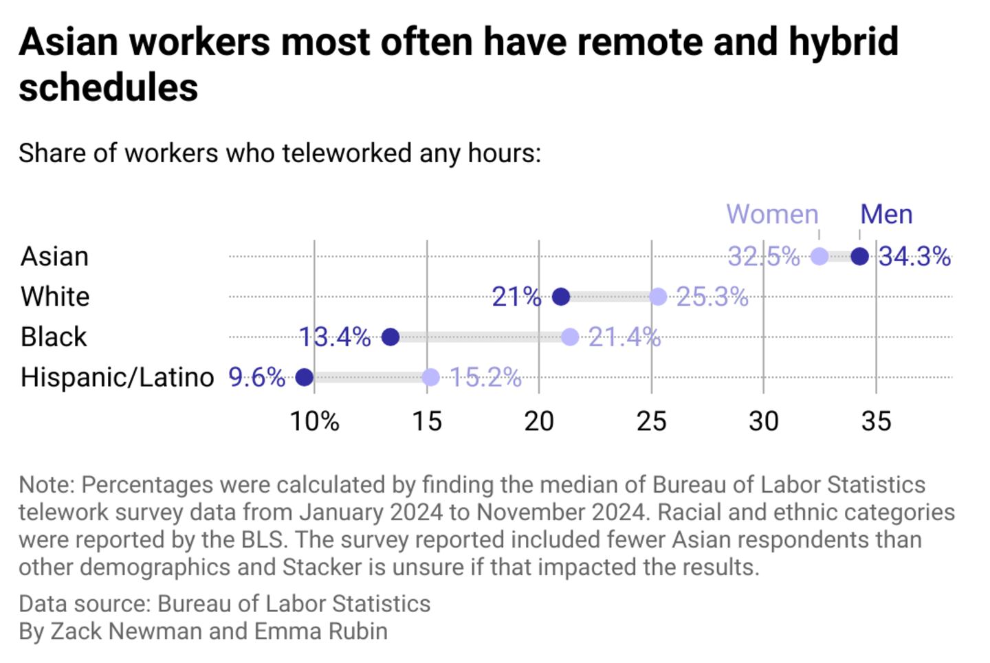 Teleworking rates vary significantly depending on a worker's gender or racial and ethnic background. BLS data shows that Asian workers are typically most likely to telework, with 34.3% of Asian men and 32.5% of Asian women saying they worked remotely some or all of the time. Hispanic or Latino workers had the lowest rates, with 15.2% of women and only 9.6% of men doing the same.