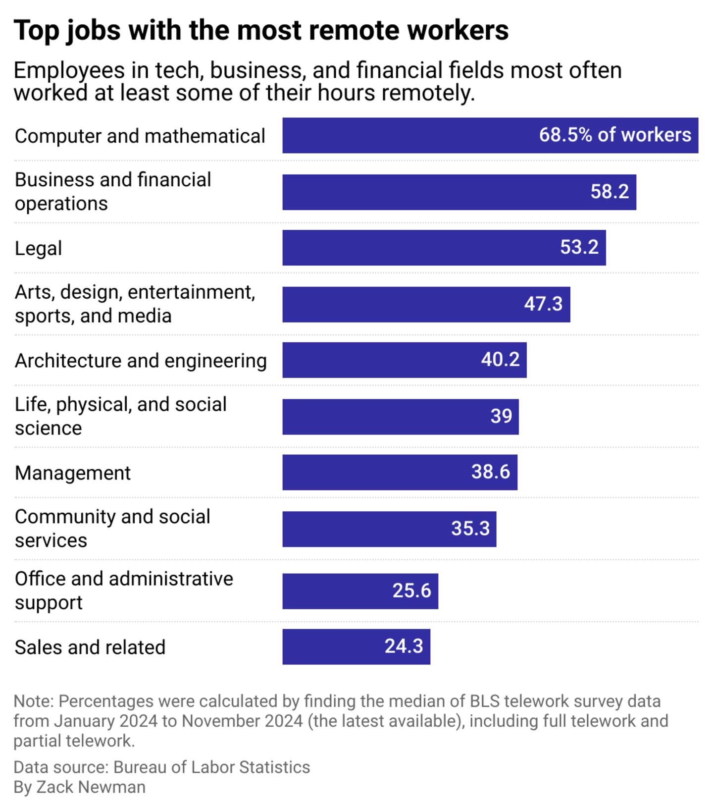 White-collar roles have the highest rates of people signing in from home. BLS data shows that more than half of employees in tech, business, and legal professions telecommute, with workers in computer- and math-related fields leading the way at a rate of 68.5%. Managers have also embraced remote work, with nearly 40% leading their teams from home at least some of the time.